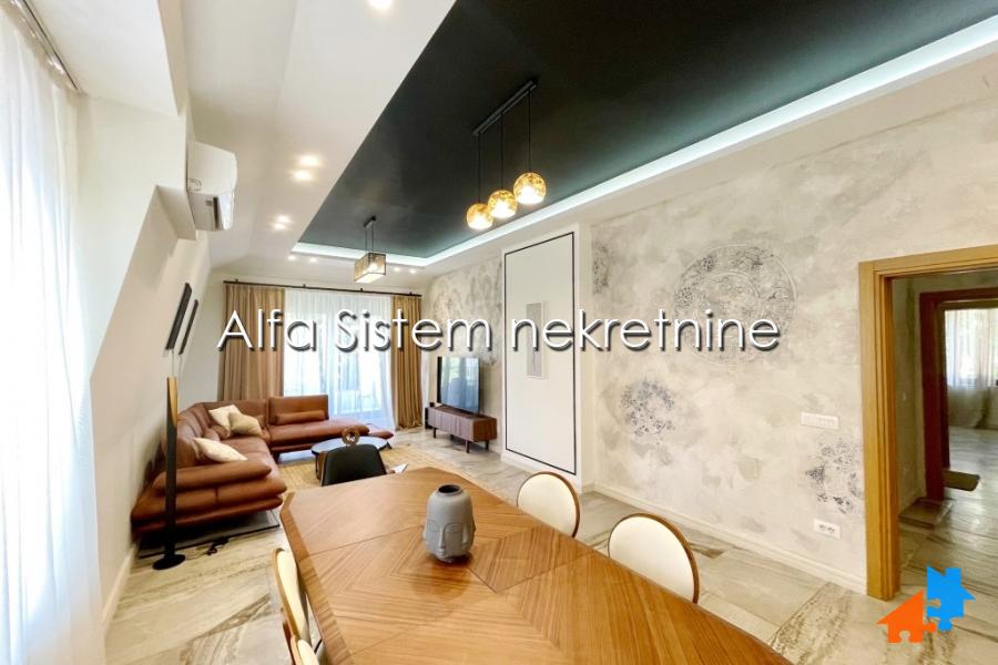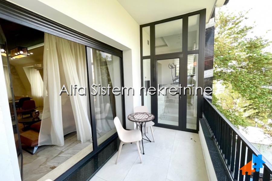 Ovaj stan je zoniran na dnevni deo, spavaci deo i terasu sa koje se ulazu u privatnu teratanu sa saunom. Dnevna soba i trpezarijski prostor predstavljaju jedinstvenu celinu i izlaze na terasu od 15 m2 a spavaci blok raspolaze sa četiri spavace sobe od po 20 m2, od kojih je jedna, master soba izdvojena i poseduje sopstveno kupatilo a druge dve sobe imaju drugo kupatilo. Spavaci blok takodje izlazi na jos jednu terasu koja ima 15 m2. Kuhinja je izdvojena kao i gostinjski wc. Stan poseduje svoju ostavu u okviru kompleksa. Uz stan ide i pripadajuca parking mesto.