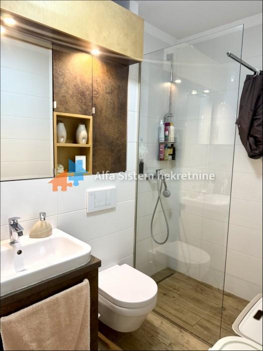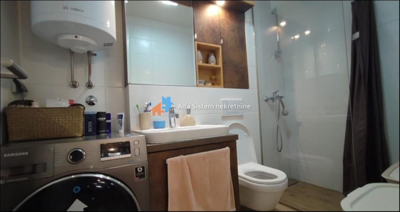 Stan se nalazi na visokom prizemlju (formalno prvi sprat) moderno projektovane zgrade sa recepcijom, obezbeđenjem 24/7, video nadzorom i liftom. Izuzetno je funkcionalno koncipiran – dnevna soba, trpezarija i kuhinja povezani su u otvoren prostor, dok se u odvojenom delu nalaze dve spavaće sobe, od kojih je jedna master sa sopstvenim kupatilom. Stan poseduje i dodatno kupatilo.